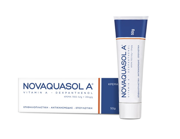 H NOVAQUASOL A είναι τοπική βιταμινούχος κρέμα, η οποία συνδυάζει την αντιυπερκερατωσική δράση της βιταμίνης Α με την αποδεδειγμένη αντικνησμώδη, επιθηλιοπλαστική και επουλωτική δράση της πανθενόλης. Η βιταμίνη Α δρα ευνοϊκά στις υπερκερατωσικές και δυσπλασικές εκδηλώσεις του δέρματος και το επαναφέρει στη φυσιολογική του κατάσταση. Η πανθενόλη ενεργοποιεί τον πολλαπλασιασμό των ινωδοβλαστών και έτσι την παραγωγή κολλαγόνου και των ελαστικών ινών, που είναι ευεργετικά για την επούλωση του δέρματος. Το ειδικό υδρόφιλο έκδοχο της Novaquasol Α, διεισδύει στο δέρμα, απορροφάται από την επιδερμίδα και τις υποκείμενες στοιβάδες και εξασφαλίζει ταχύ θεραπευτικό αποτέλεσμα.